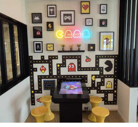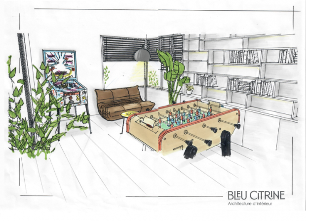 Créer une grande salle accueillante et chaleureuse, inspirée de l’univers du jeu vidéo mais aussi propice à la lecture et aux échanges. Rompre avec le caractère cloisonné et sombre des lieux pour en faire un espace lumineux et attractif.