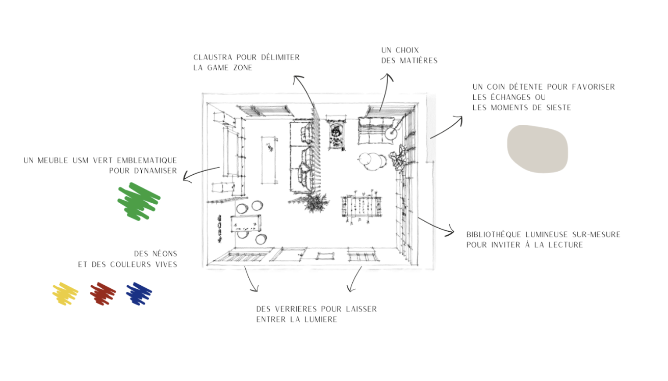 • Organisation de l’espace en différents univers : coin jeux vidéo, coin lecture, coin détente.